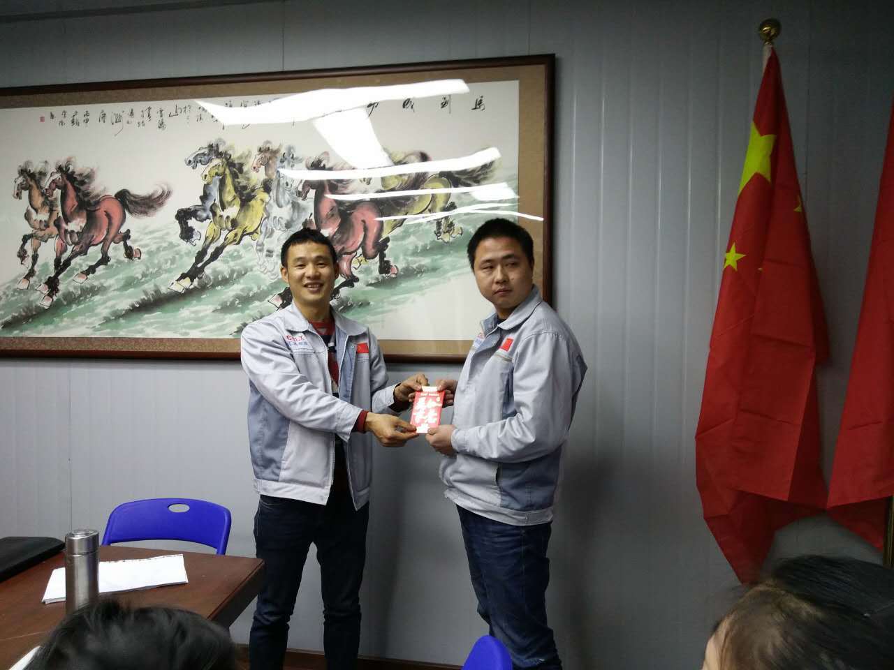 大會進(jìn)行到尾聲,對每月度之星的選舉。胡總(圖左)為月度之星徐財華戰(zhàn)士(圖右)頒發(fā)獎金。同時感謝他對于公司的無私奉獻(xiàn),對于同事的無微關(guān)懷,并擁護(hù)匯利興這個大家庭;同時匯利興還有很多人都在默默地奉獻(xiàn)與努力(例如:成都辦事處的張國桃經(jīng)理,在今年6月17日與戰(zhàn)車傳奇進(jìn)軍成都開疆?dāng)U土、奮戰(zhàn)近一年),在此感謝他無私的奉獻(xiàn)。匯興智造有著你們這群人的努力與付出,相信我們會更加靠近我們的夢,實現(xiàn)中國智能裝備全產(chǎn)業(yè)鏈集成智造標(biāo)桿,繼續(xù)引領(lǐng)行業(yè)的發(fā)展。