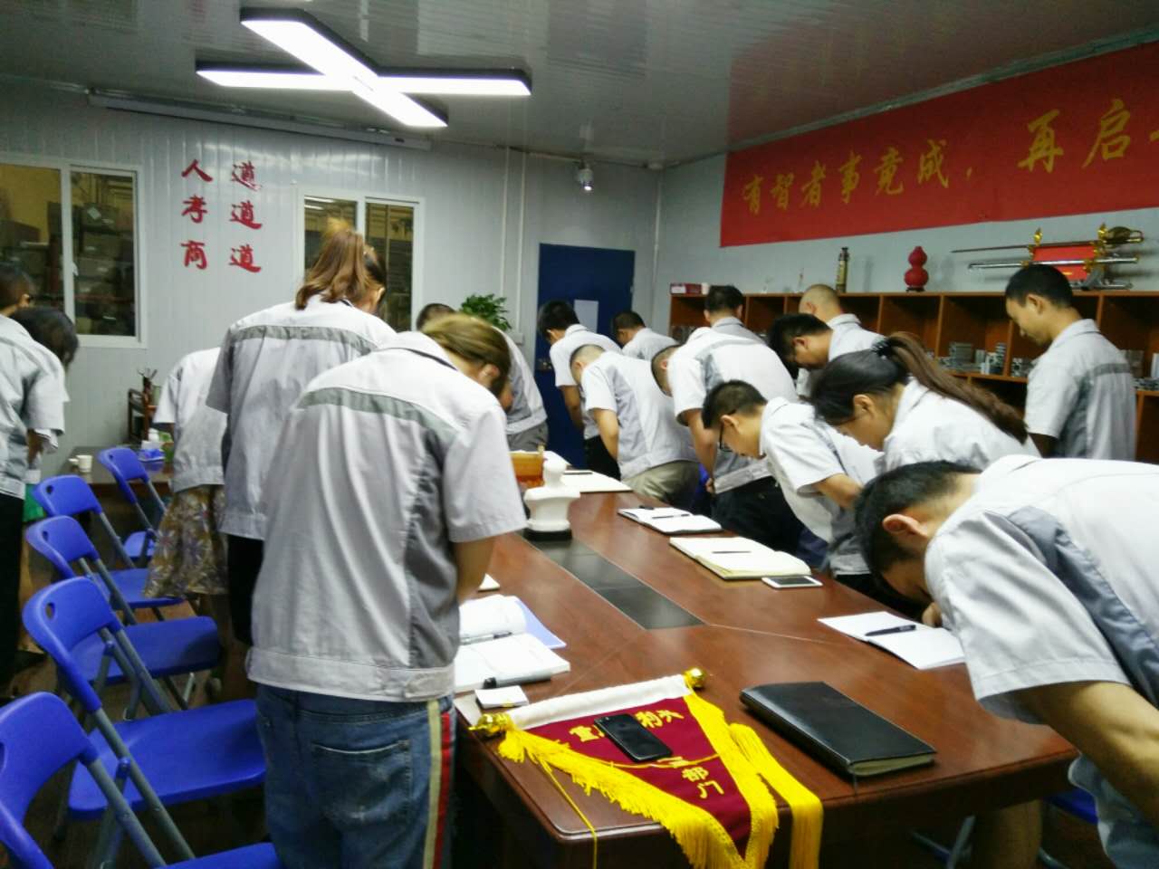 2017年8月1日晚,我司全體人員在匯興學(xué)校召開七月月度大會,依次由自我價值稱估稱及簽到入場。大會召開前,全體人員對企業(yè)三道(人道、孝道、商道)行三鞠躬,隨后進入會議主題。