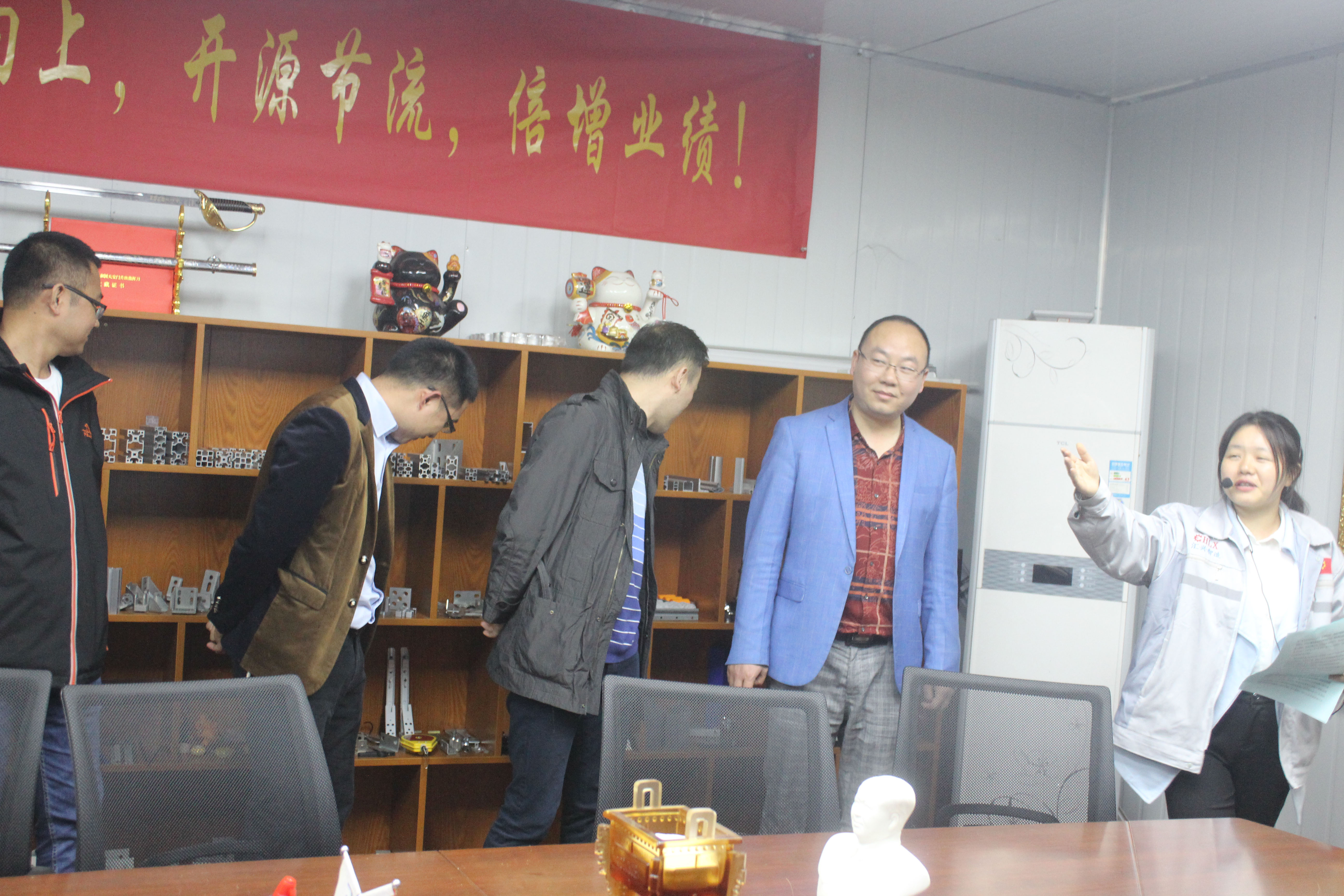 企業(yè)文化大使小敏正在為客人介紹匯利興文化 在此,客服部小敏(企業(yè)文化大使)為來訪的客人們相繼介紹了我司的企業(yè)文化,并帶領(lǐng)客人參觀了匯利興廠容廠貌,詳細(xì)介紹了匯利興的發(fā)展史及企業(yè)文化(三道:人道、孝道、商道,企業(yè)精神:用情做人、用心做事),并帶領(lǐng)客人初步了解了工業(yè)鋁型材、滾筒、精益管、工裝板、精密工業(yè)配件等材料的認(rèn)識(shí),同時(shí)介紹了我司企業(yè)愿景:誓力打造中國自動(dòng)化配件第一品牌,更好的滿足客戶個(gè)性化定制和柔性化生產(chǎn);此后對(duì)于匯利興濃厚的企業(yè)文化及厚重的企業(yè)實(shí)力,一致獲得了客人們高度的贊許及認(rèn)可并表示與匯利興合作十分放心。 客人與匯利興家人合影圖 客人為“喜上眉梢、鴻運(yùn)當(dāng)頭”錦上添花圖景 “相識(shí)滿天下,知心在匯興”,來訪客人受邀相繼在“喜上眉梢 鴻運(yùn)當(dāng)頭”留下深刻的印記,為此錦上添花?!坝36娭?,故源源而來”,相聚匯利興,故交友于匯利興同友人一起共發(fā)展共進(jìn)步。