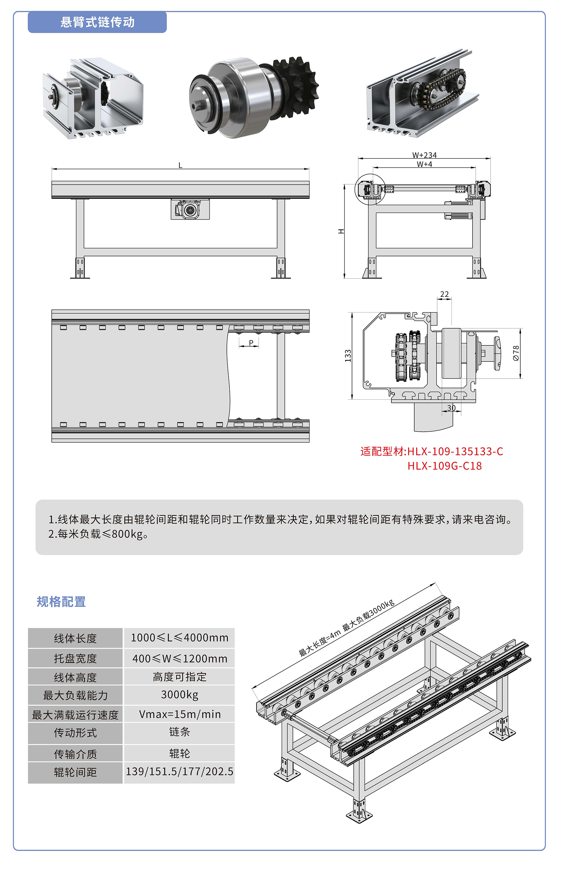 采用135133鋁型材,鏈輪傳動(dòng),鍍鉻滾輪鑲嵌銅套實(shí)現(xiàn)積放功能,負(fù)載3000kg/米,最大負(fù)載速度15M/min, 輪距139、151.5、177、202.5可選,適用托盤寬度400-1200mm,線體長(zhǎng)度范圍1000-4000mm, 高度根據(jù)需求定制.