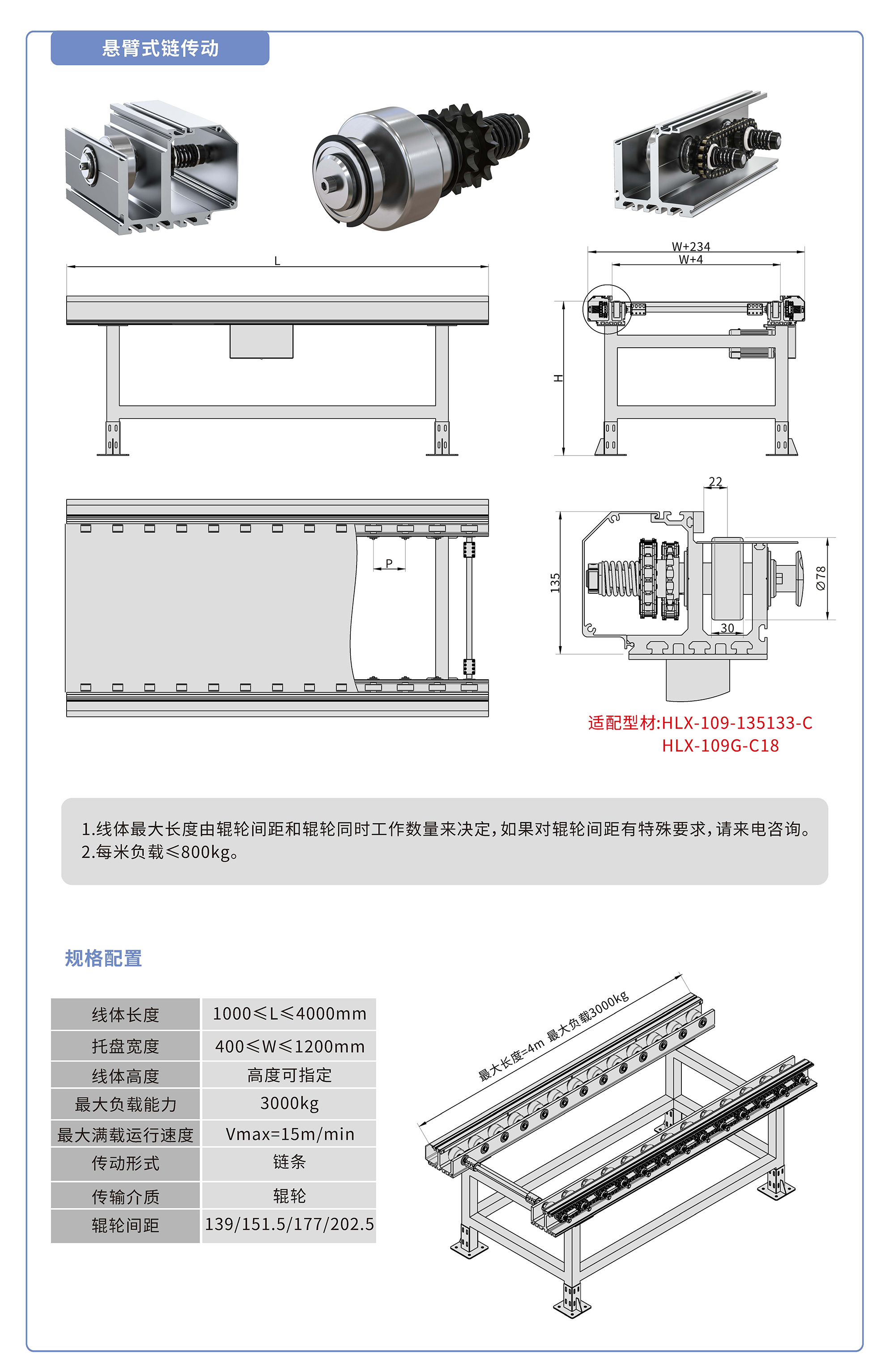 采用135133鋁型材,鏈輪傳動,鍍鉻滾輪鑲嵌銅套實現(xiàn)積放功能,負載3000kg/米,最大負載速度15M/min, 輪距139、151.5、177、202.5可選,適用托盤寬度400-1200mm,線體長度范圍1000-4000mm, 高度根據(jù)需求定制.