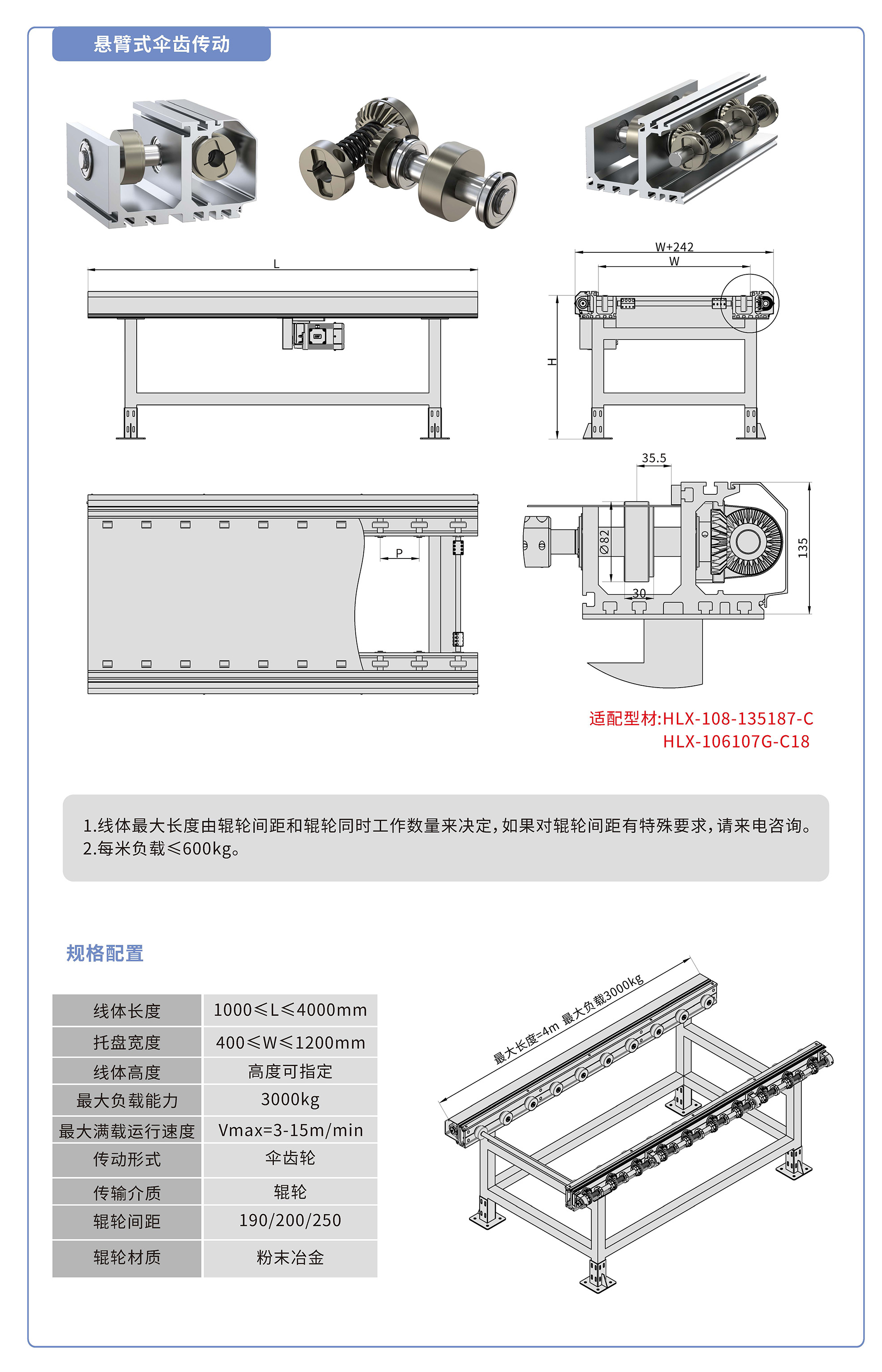 采用135187鋁型材,傘齒驅(qū)動,粉末冶金滾輪鑲嵌銅套實現(xiàn)積放功能,負載3000kg/米,最大負載速度15M/min, 輪距190、200、250可選,適用托盤寬度400-1200mm,線體長度范圍1000-4000mm, 高度根據(jù)需求定制.